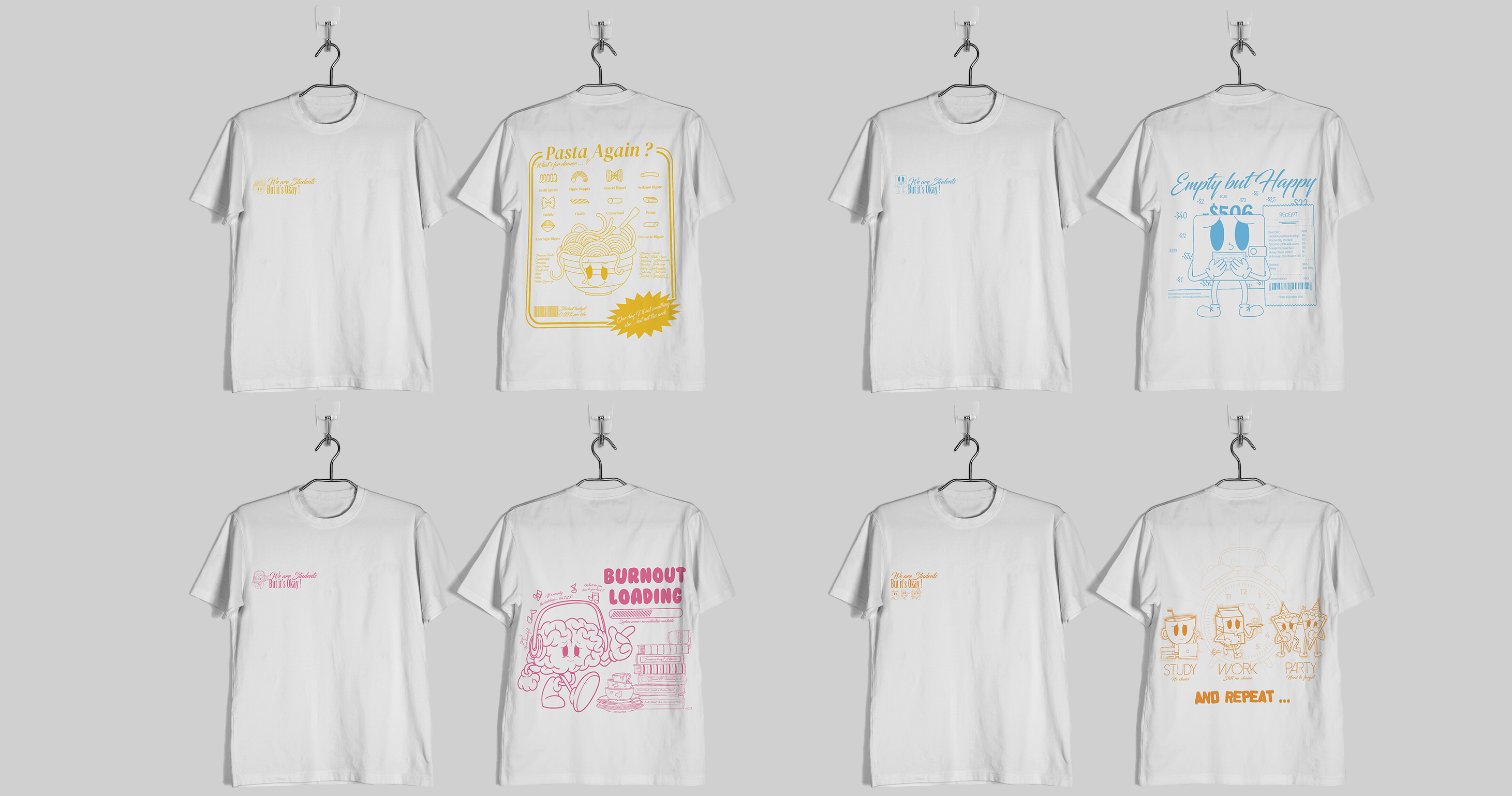 A collection of illustrated T-shirts that tell a humorous and self-deprecating tale of the realities of student life. From precariousness to dodgy food and system D, each visual transforms a shared hardship into a funny, colourful and (almost) desirable illustration.
